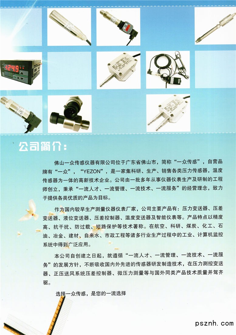 佛山一眾傳感儀器有限公司 簡稱“一眾傳感” ,位于全國經濟技術發展最迅速最成熟的地區之一——佛山,是一家專業研發、生產、銷售、服務各類壓力傳感器、智能控制系統一體化的優質廠家。自營品牌有“一眾”,“YEZON”,我公司集國內外同類產品的優點,以抗干擾,防水,防過載,短路保護等技術著稱,具有先進的工藝設備及完善的測試手段,嚴格保證產品制造質量。