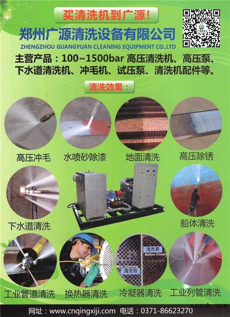 鄭州廣源清洗設備有限公司高壓清洗機高壓清洗設備高壓泵的專業生產廠家!是一家專門致力于高壓水射流研發的高科技企業。著眼世界領軍技術,與水射流清洗行業巨頭KAMAT合作,不斷提升我公司優良產品性能的質量體系。公司非常重視產品的研發合作,與國內多家科研院所緊密合作,使產品暢銷全國,并逐步同國際制泵水平接軌。   公司常年經營各種高壓水射流清洗機,德國進口超高壓清洗機、高壓泵、沖毛機、德國進口高壓膠管、高壓水槍、進口旋轉噴嘴、三圍旋轉噴頭,各種管道噴頭。廣泛應用于石油、化工、鋼鐵、船舶、水電、制糖、煤炭、礦山、建筑、汽車制造、市政環衛、管道試壓、高壓水射流清洗等廣泛領域。