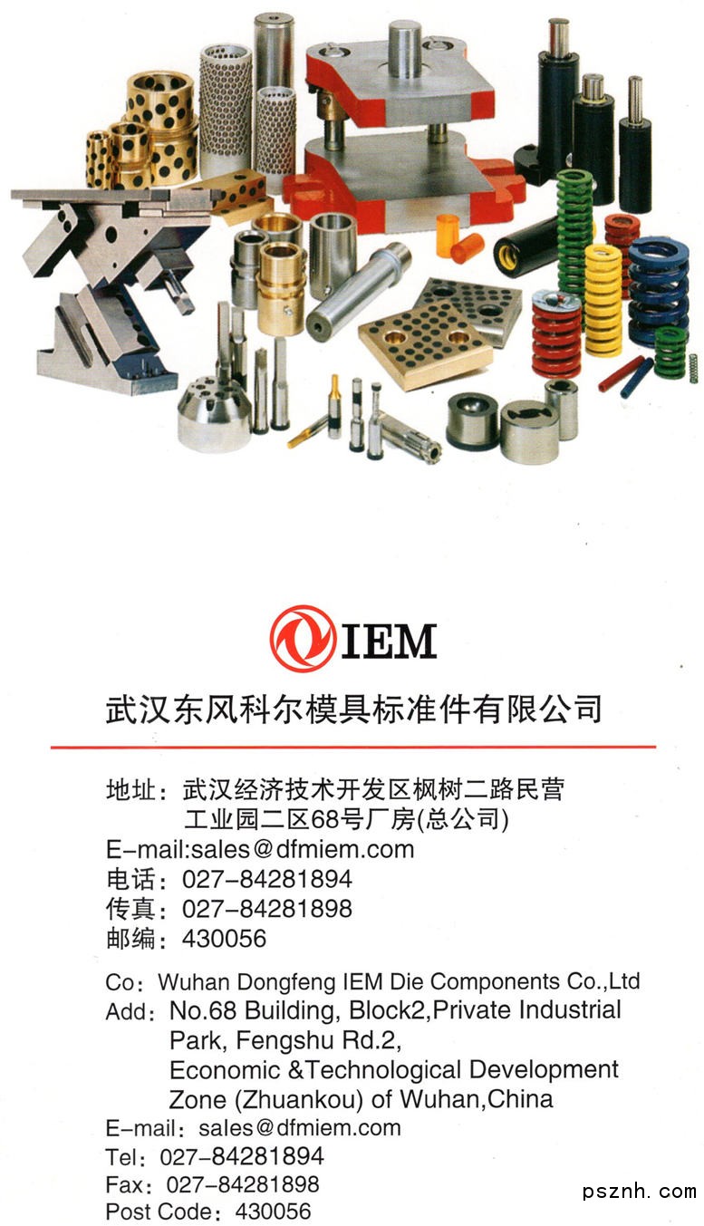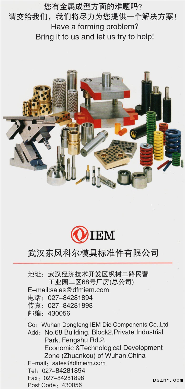 公司注冊于中國湖北省武漢經(jīng)濟(jì)技術(shù)開發(fā)區(qū)高科技產(chǎn)業(yè)園,分設(shè)武漢、十堰兩個生產(chǎn)工廠,在美國、德國、意大利、日本、韓國、印度分別建立了分銷渠道,在中國設(shè)有上海、廣州、天津、重慶等銷售辦事處。產(chǎn)品包括斜楔、折邊機(jī)構(gòu)、沖頭、凹模、固定板、導(dǎo)柱、導(dǎo)套、導(dǎo)板等全系列沖壓模具標(biāo)準(zhǔn)件產(chǎn)品,東風(fēng)IEM標(biāo)準(zhǔn)涵蓋了NAAMS、VDI、JIS等行業(yè)標(biāo)準(zhǔn),以及全球主要汽車公司的專有標(biāo)準(zhǔn)。公司以豐富的產(chǎn)品線,以及覆蓋全球的銷售網(wǎng)絡(luò),為客戶提供方便快捷的服務(wù)。