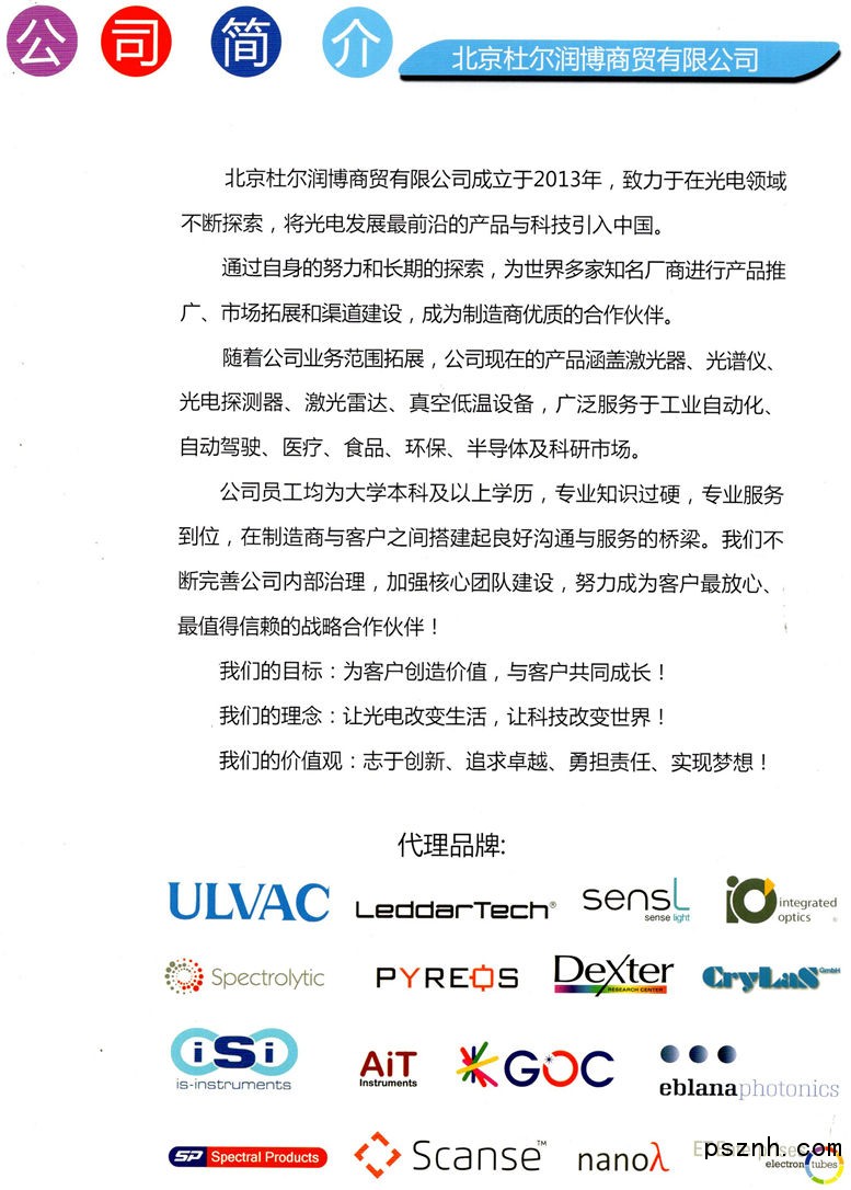 北京杜爾潤博商貿有限公司成立于2013年,專注光電領域,致力于將光電行業最前沿的產品與科技引入中國。我們通過不懈的努力,已經成為世界光電領域內的多家制造廠商的優質合作伙伴。積極進取地為他們在中國進行產品推廣、市場拓展和渠道建設。我們將優質高科技的光電產品引入國內,幫助科研機構與科技公司改善產品應用、提高性能質量。共享科技,傳遞價值!