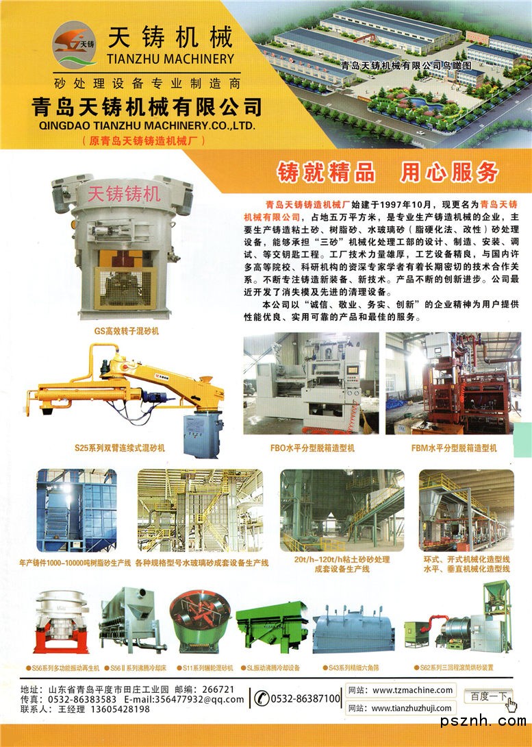 青島天鑄機械有限公司(原青島天鑄鑄造機械廠),始建于一九九七年,占地面積50000平方米,是集科研、設計、制造、安裝調試于一體的鑄造機械專業生產廠家;原機械工業部鑄造機械定點生產企業;已通過ISO9001質量體系認證。本廠在鑄造砂處理設備的研制開發中,先后開辟了國內S14系列混砂設備、冷凝樹脂砂再生設備的新領域。本廠與國內許多高等院校、科研機構的資深專家學者有著長期密切的技術合作關系,先后研制成功了20多個類別、200多種新產品。