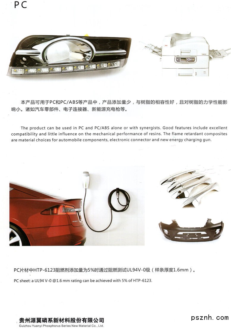 公司現有的磷系阻燃劑HTP-6123系列產品,技術國內首創,國際領先,具有環保無鹵,熱穩定性高、可熔融等優異的性能,可廣泛應用于高溫尼龍、聚酯、聚碳酸酯等產品中,如汽車零部件、新能源充電槍、窗簾、墻布、地毯等。