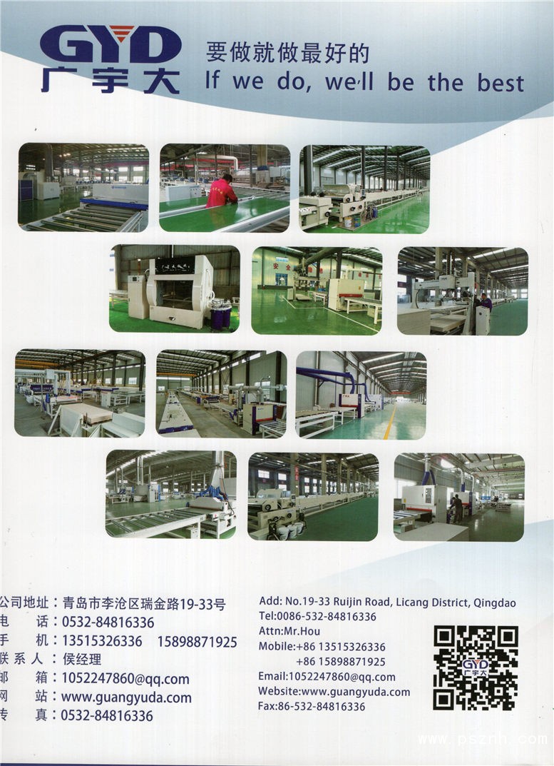 青島廣宇大機械設備有限公司是專業化生產室內裝飾板及建筑外墻裝飾板涂裝機械設備、軟瓷設備的企業。