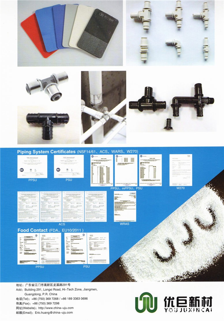 優巨公司聚芳醚砜系列產品已通過美國UL防火安全,FDA食品安全,NSF飲用水安全,ISO10993醫療衛生安全及歐盟Rohs2.0,REACH等環保安全方面權威認證;產品遠銷北美及歐洲主要發達國家,獲得全球各應用領域戶的普遍認可。