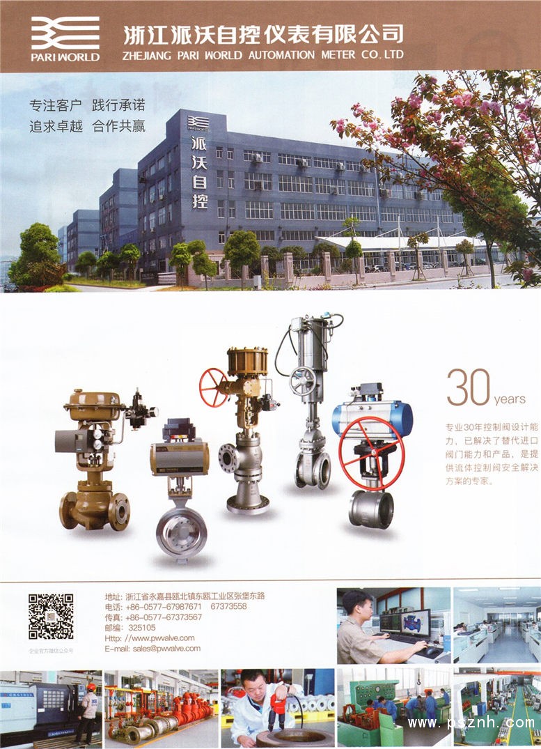 浙江派沃自控儀表有限公司(原永嘉縣東方自動化儀表廠)是控制領(lǐng)域研發(fā)及生產(chǎn)的領(lǐng)先企業(yè)之一。公司始建于1985,注冊資金5020,二十余年致力于產(chǎn)品的開發(fā)與創(chuàng)新。公司的產(chǎn)品質(zhì)量穩(wěn)定可靠并以其獨特的性能在廣大用戶中享有較高的信譽,不斷引進(jìn)消化國外先進(jìn),自行研制了特種調(diào)節(jié)閥,應(yīng)用于自動化成套技術(shù)方面達(dá)到國際先進(jìn)水平,使產(chǎn)品在控制系統(tǒng)領(lǐng)域里,再登新臺階。