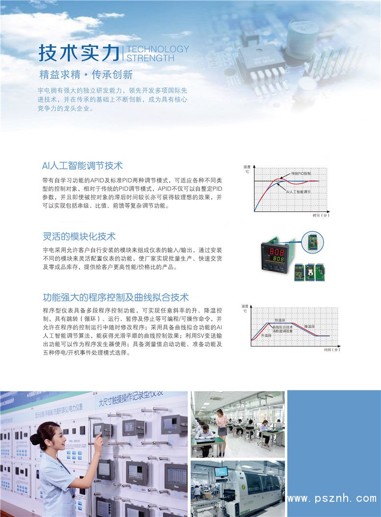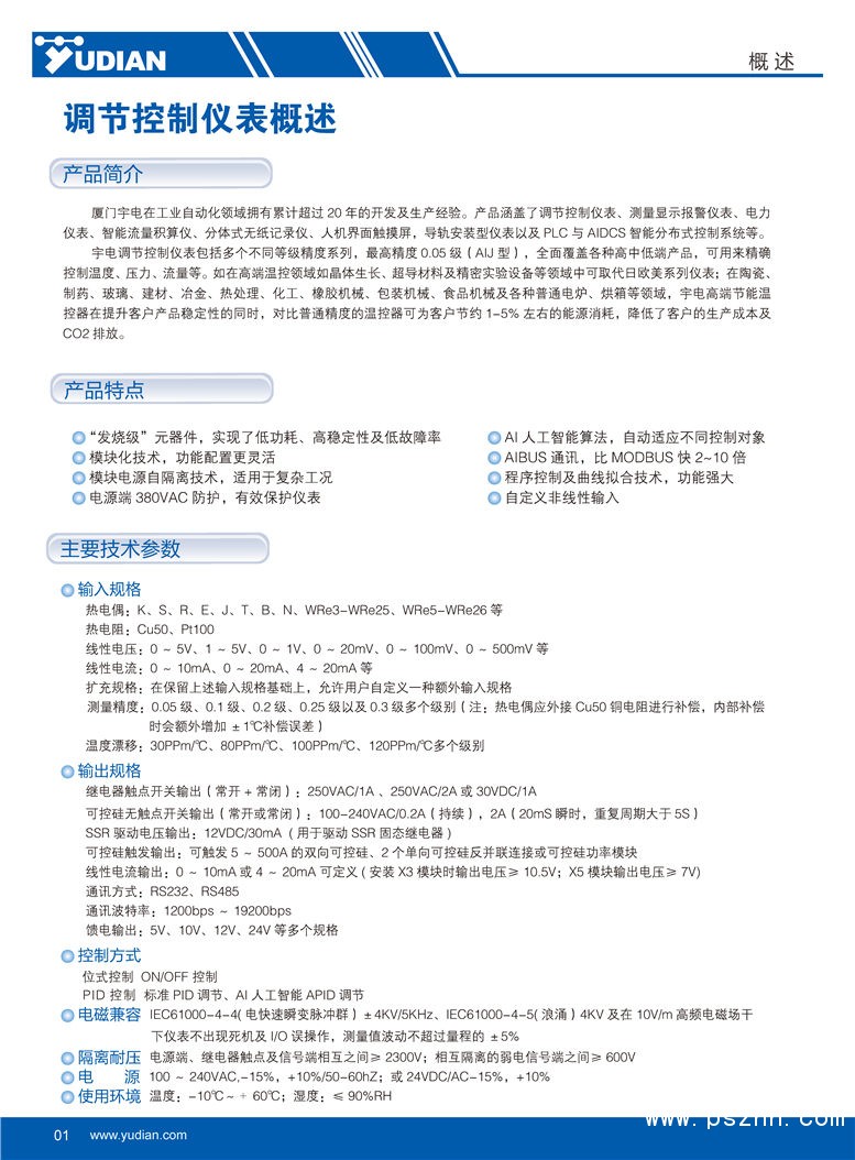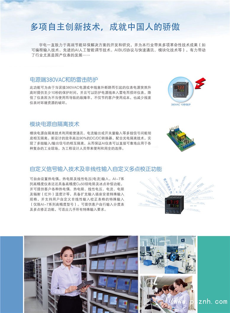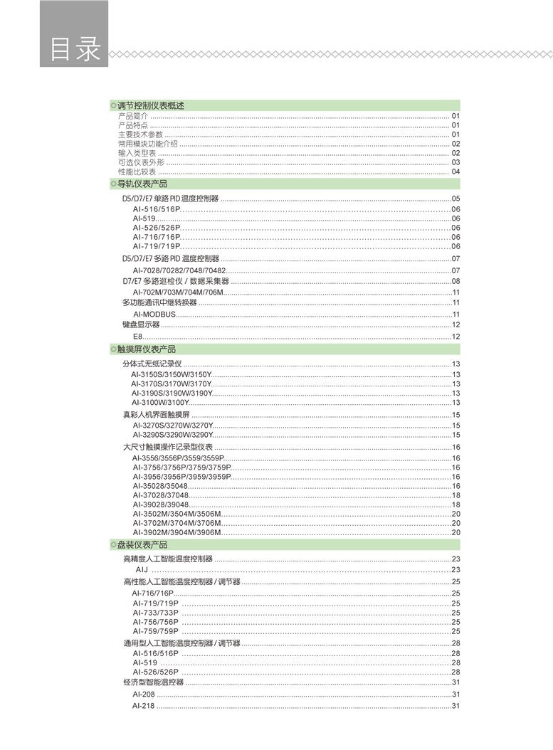 公司產品包括單路及多路測量顯示報警儀、流量積算儀、高精度PID調節器、智能溫控器、導軌安裝儀表、電力測量儀表、手持式精密測溫儀、閃光報警器、可控硅調功觸發器、SSR固態繼電器,分體式無紙記錄儀、觸摸屏控制系統及AIDCS智能分布式控制系統等,廣泛應用于化工、熱電、石化、制藥、冶金、機械、電爐、熱處理、食品、造紙、塑膠、包裝等領域。