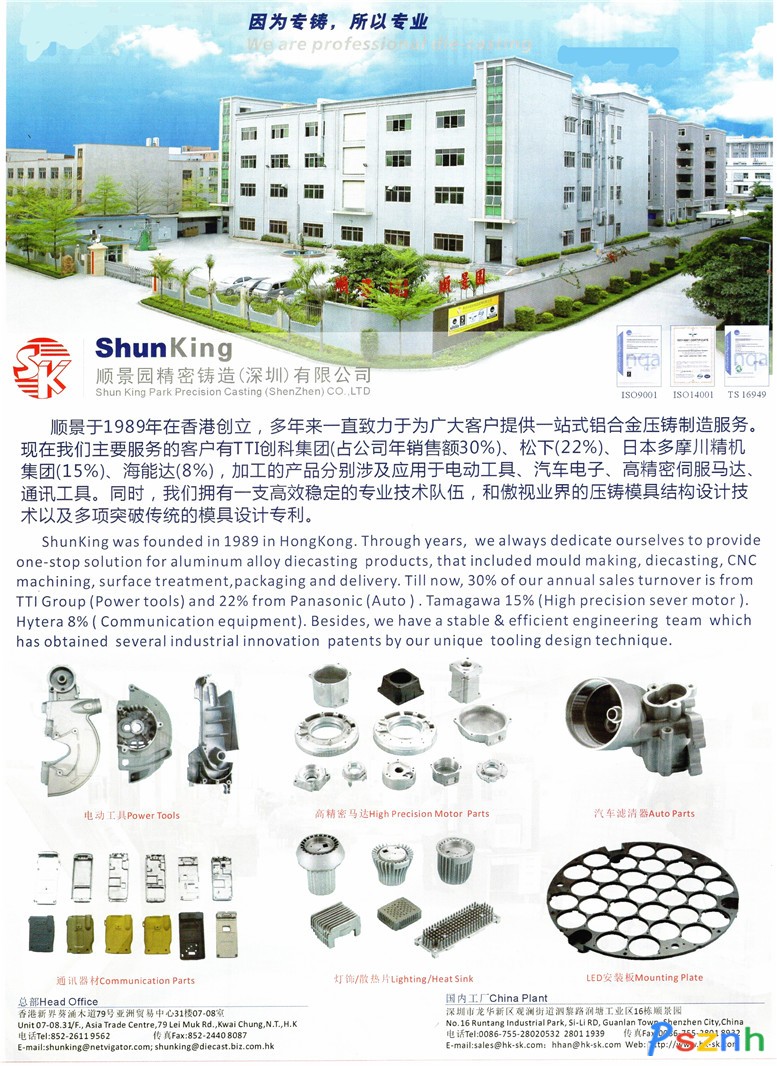 順景, 于一九八九年秋在香港誕生;歷經三年的挫折與探索,在一九九二年秋正式以“順景鋁合金模制造廠"注冊成立;一九九三年購進第一臺日本冷室壓鑄機,在中國深圳成立“順景壓鑄制品廠",二零一一年正式轉型為外商獨資企業并更名為“順景園精密鑄造(深圳)有限公司"。多年來,我們一直致力于為客戶提供集制模、壓鑄、加工、CNC精加工、表面處理于一身的優質快捷的一站式鋁合金壓鑄制造服務。