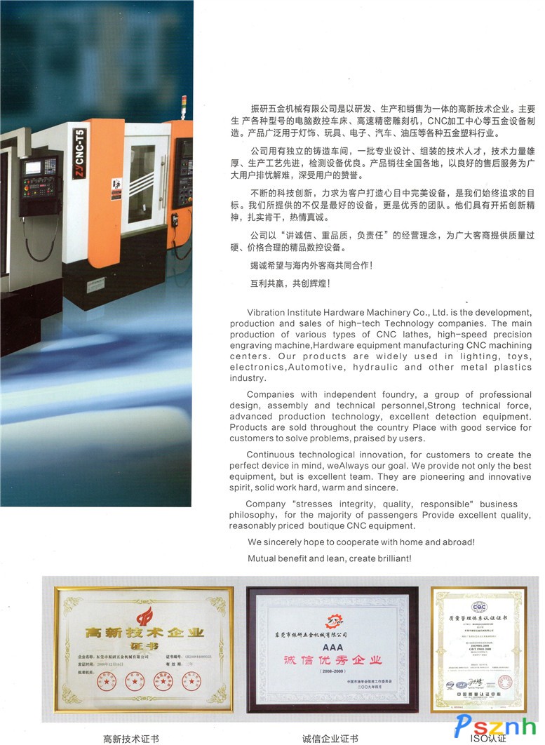 東莞市振研五金機械有限公司是一家科技與創新相結合為一體的,全面發展型企業, 公司專業生產CNC數控車床,高速精密雕刻機,CNC加工中心等.在市場竟爭日益激烈的情況下,公司始終堅持以提高產品的性能與質量為目標,完善的售后服務為宗旨,為公司贏來了廣大新老客戶的高度贊譽與推崇,同時也展現出了公司良好的企業形象,多家廠商的長期支持與合作又為公司建立下不可動搖的商業信譽。