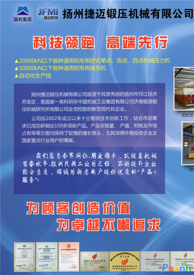 揚州捷邁鍛壓機械有限公司是''揚州鍛壓機床有限公司''與''濟南鑄造鍛壓機械研究所''共同投資組建的新型現代化企業。主要生產各種類型和規格的液壓機、閉式機械壓力機及其自動化成套設備。| 公司全體員工按照''揚州捷邁--永無止境地超越!''的總體追求,堅持貫徹以''開發新品求生存,拓寬市場求業績,夯實基礎求發展,管理創新求增效''的經營管理理念,精心打造“揚州捷邁”品牌。公司成立以來,在董事會的正確領導和各級政府部門的關懷支持下,通過全體員工的共同努力,已先后榮獲:''江蘇省高新技術企業”;“江蘇省民營科技企業”;“江蘇省火炬項目承擔單位”;“質量、信譽先進單位”;“工商銀行資信AA等級”;“國家火炬計劃邗江金屬板材加工設備產業基地骨干企業”等榮譽稱號;揚州市大型鍛壓設備及成套化、集成化工程技術研發中心和揚州市級企業技術中心就設在本公司。| 公司充分利用投資雙方多年來在鍛壓產品領域所積累的產品設計開發經驗和在機械加工制造方面的特有優勢,以及已形成的遍布全國的銷售服務網絡,向市場提供先進、高效、實用、可靠的優質鍛壓產品。以其產品在性能、質量、價格、服務、周期、信譽等方面的綜合優勢,限度地去滿足不同用戶的不同層次的需求。|| 揚州捷邁人堅信: 沒有不講理的用戶| 只有不滿意的產品| 用戶滿意是我們永遠的追求!