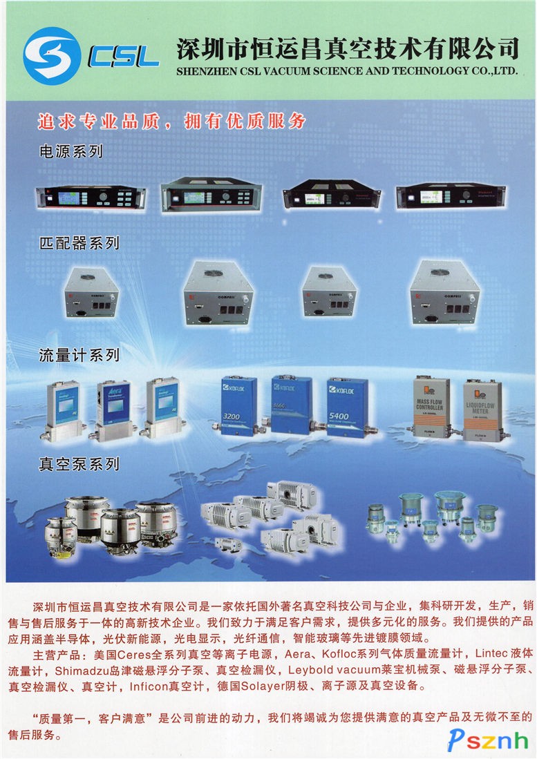 深圳市恒運昌真空技術有限公司擁有一批多年從事真空鍍膜專業技術人員和經驗豐富的市場銷售人員。公司主營代理國外著名企業及公司的真空鍍膜產品,包括:AE全系列真空等離子電源,Ceres全系列真空等離子電源, HUETTINGER霍廷格全系列真空等離子電源,Aera、MKS ,Warwick、Kofloc等系列氣體質量流量計,萊寶全系列真空泵及檢漏儀,島津磁懸浮分子泵及檢漏儀,VAT真空閥,inficon真空計,Sci、Soleras陰極,Umicore、Soleras濺射靶材,FHR真空反應濺射閉環控制器,ECD真空在線測溫儀等。“客戶滿意”是公司前進的動力,我們將竭誠為您提供滿意的真空產品及無微不至的售后服務。