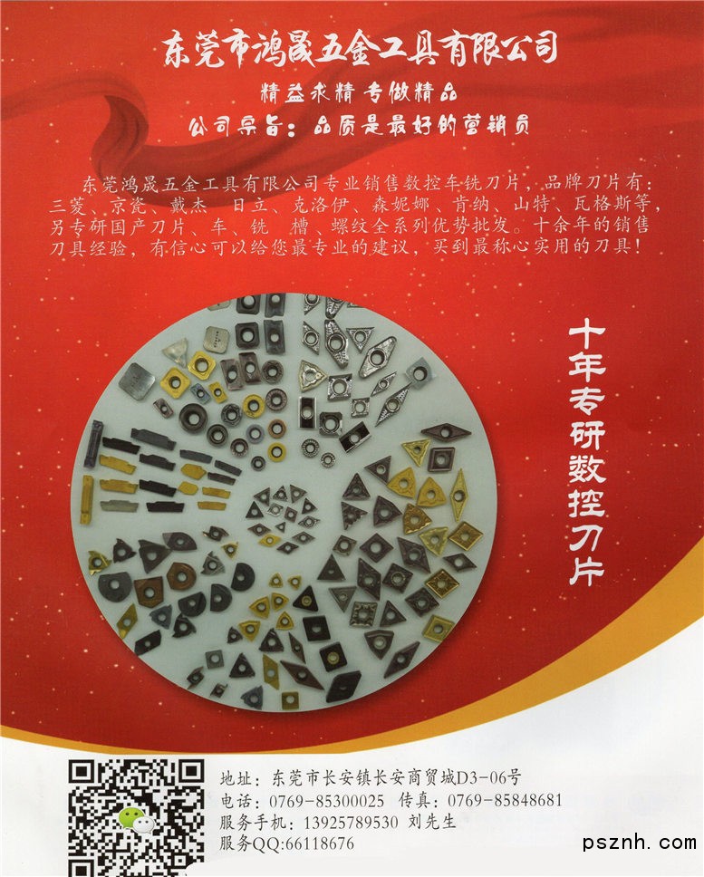 公司數(shù)控刀具方面種類齊全,主要針對(duì)CNC加工中心、NC數(shù)控車床刀具。建立數(shù)控刀片為主的全國(guó)性批發(fā)銷售網(wǎng)絡(luò),數(shù)控刀片品牌代理以京瓷、三菱、KORLOY、日立為主,肯納、瓦爾特、東芝、黛杰、卡邁斯、威迪亞等為輔。臺(tái)灣RBH、世邦(stanny)鏜孔系統(tǒng),數(shù)控刀桿品牌包括三井、三祿、益詮、三韓、威龍、德克、亞肯、EGO等知名品牌;銑刀 品牌主要有三菱、HKF、DUMA、LV、OCT 等。