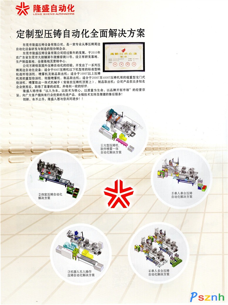 朗鎮(zhèn)犀牛陂雅窯街33號,設(shè)立有研發(fā)基地、生產(chǎn)制造基地、倉儲基地及營銷中心。公司不斷吸取國外壓鑄自動化的經(jīng)驗,開發(fā)出了一系列壓鑄周邊自動化設(shè)備:適合于800T壓鑄機以下機型用的標準型蝸輪連桿給湯機、噴霧機及制品取出機;適合于1000T以上壓鑄機用的重型給湯機、伺服噴霧機、制品取出機;適合于2000T至4000T壓鑄機用的超重型龍門式給湯機、噴霧取出一體式機械手(安裝在壓鑄機頂面上)、制品取出機;公司產(chǎn)品在眾多知名企業(yè)使用后,取得了顯著的成效,并得到一致的好評。隆盛人將傳承“以人為本,以技術(shù)為核心,以質(zhì)量為生命,以品牌開拓市場”的經(jīng)營宗旨,向廣大客戶提供有行業(yè)優(yōu)勢的先進產(chǎn)品、全程技術(shù)支持及便捷的售后服務(wù)!創(chuàng)新,永不止盡,隆盛人愿與您共同進步!