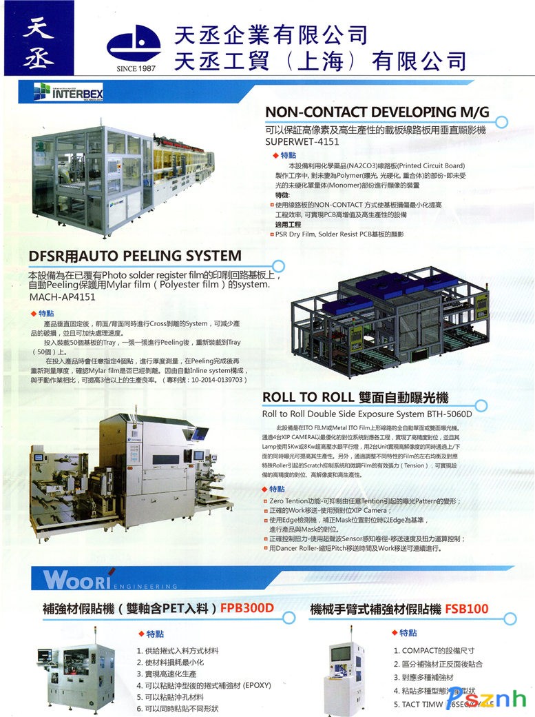 | 1. 電子業相關制程設備 2. 印刷電路板相關制程設備 3. FPC 基板相關制程設備 4. 上述相關各種臺灣制造設備 |