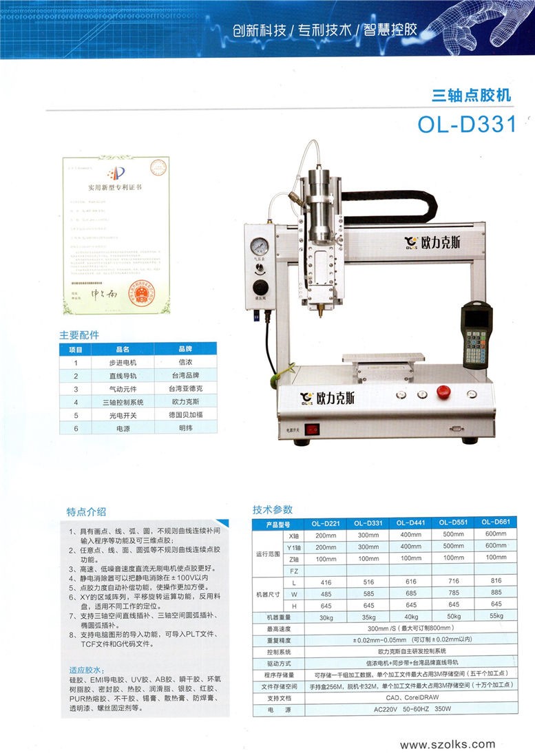 | 深圳市歐力克斯科技有限公司是一家與眾不同的高新技術(shù)制造型廠商,專注于制造熔膠機(jī)、鎖螺絲機(jī)、點(diǎn)膠機(jī)、灌膠機(jī)流體控制設(shè)備事業(yè),可定制非標(biāo)式設(shè)備。公司成立于2007年,現(xiàn)有約3000平米寬敞標(biāo)準(zhǔn)化廠房,建立了完善的生產(chǎn)管理制度和嚴(yán)格的質(zhì)量監(jiān)督檢驗(yàn)體系,研發(fā)、生產(chǎn)、制造、銷售、負(fù)責(zé)人問(wèn)責(zé)制管理,為我們產(chǎn)品的每一個(gè)細(xì)節(jié)盡可能達(dá)到“零”缺陷的質(zhì)量保證。歐力克斯技術(shù)團(tuán)隊(duì)成員均為本科以上學(xué)歷并具有10年以上點(diǎn)膠機(jī)和灌膠機(jī)、熔膠機(jī)、鎖螺絲機(jī)設(shè)備的研發(fā)、生產(chǎn)、售后工作經(jīng)驗(yàn);具備專業(yè)流體計(jì)量控制知識(shí),具有優(yōu)秀的產(chǎn)品研發(fā)、設(shè)計(jì)能力,能快速響應(yīng)市場(chǎng)和滿足客戶需求,致力于點(diǎn)膠機(jī)、灌膠機(jī)、熔膠機(jī)、鎖螺絲機(jī)的設(shè)備的研究、設(shè)計(jì)、模似、分析、實(shí)驗(yàn)工作。 在勞動(dòng)力缺乏、人力成本越來(lái)越高的今天,我們秉承一貫專注和持續(xù)改時(shí)的創(chuàng)新精神和歐力克斯自主知識(shí)產(chǎn)權(quán)的核心技術(shù)不斷推陳出新,成功有效地為客戶由傳統(tǒng)的人工點(diǎn)膠、灌膠作業(yè)轉(zhuǎn)化到先進(jìn)精確的全自動(dòng)化點(diǎn)膠、灌膠作業(yè)中來(lái),更好的為廣大客戶擴(kuò)大生產(chǎn)規(guī)模、提升公司形象、節(jié)約膠水成本、提高工作效率。 |