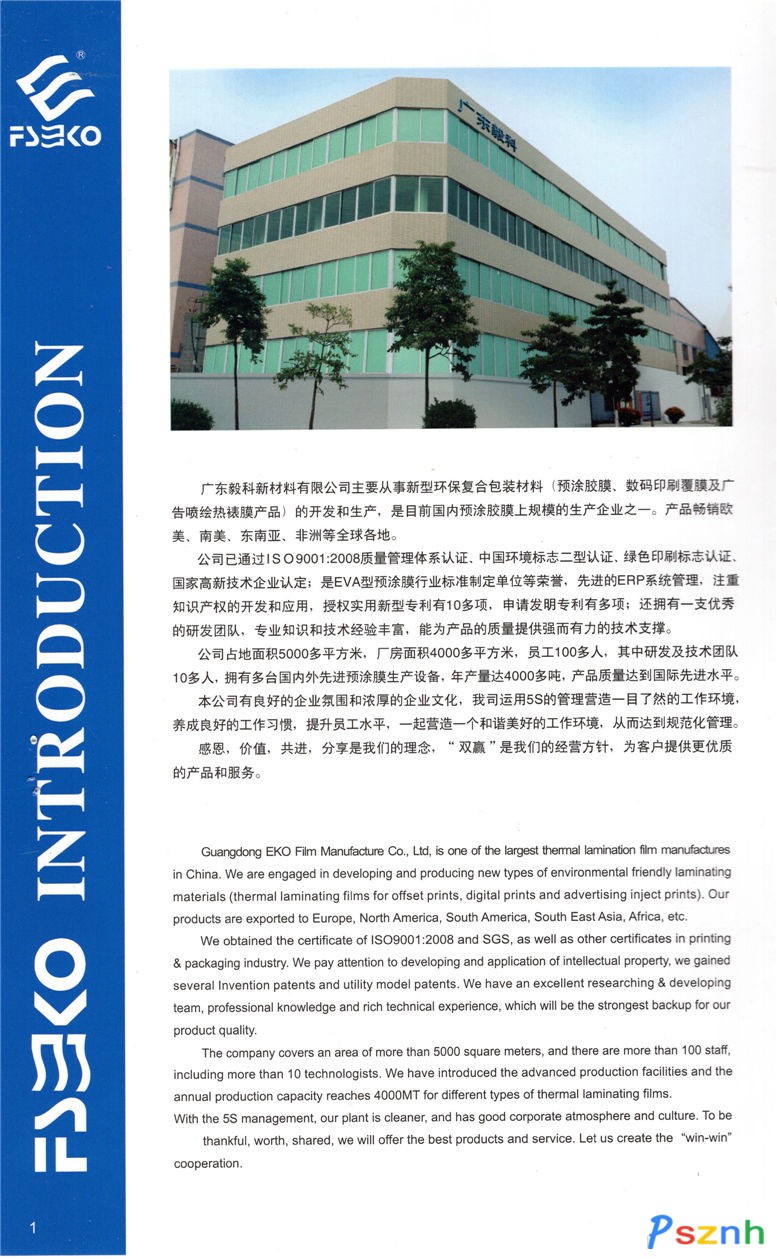 廣東毅科新材料有限公司從1999年開始研發復合型的預涂膜,也是國內最早復合型預涂膜生產研發廠家,十幾年來我們不斷努力改進產品,優化產品性能,制造多元化復合材料產品。公司主營產品BOPP預涂膜、PET預涂膜、數碼印刷預涂膜 ,廣告噴繪熱裱膜,PET地暖復合材料,產品應用于包裝印刷覆膜、辦公用品覆膜,廣告熱裱覆膜、建筑復合材料、光學復合材料等領域 。公司已通過ISO09001:2008質量管理體系認證、綠色印刷環保標志認證、國家高新技術企業認定;EVA型預涂膜行業標準制定單位等榮譽,先進的ERP系統管理,注重知識產權的開發和應用,授權實用新型專利有多項,申請發明專利多項;還擁有一支優秀的研發團隊,專業知識和技術經驗豐富,能為產品的質量提供強而有力的技術支撐。     有良好的企業氛圍和濃厚的企業文化,我司運用5S的管理營造一目了然的工作環境,養成良好的工作習慣,提升員工水平,一起營造一個和諧美好的工作環境,從而達到規范化管理。 感恩,價值,共進,分享是我們的理念,“雙贏”是我們的經營方針,我們將進一步完善企業質量管理體制,為客戶提供更優質的產品和服務。