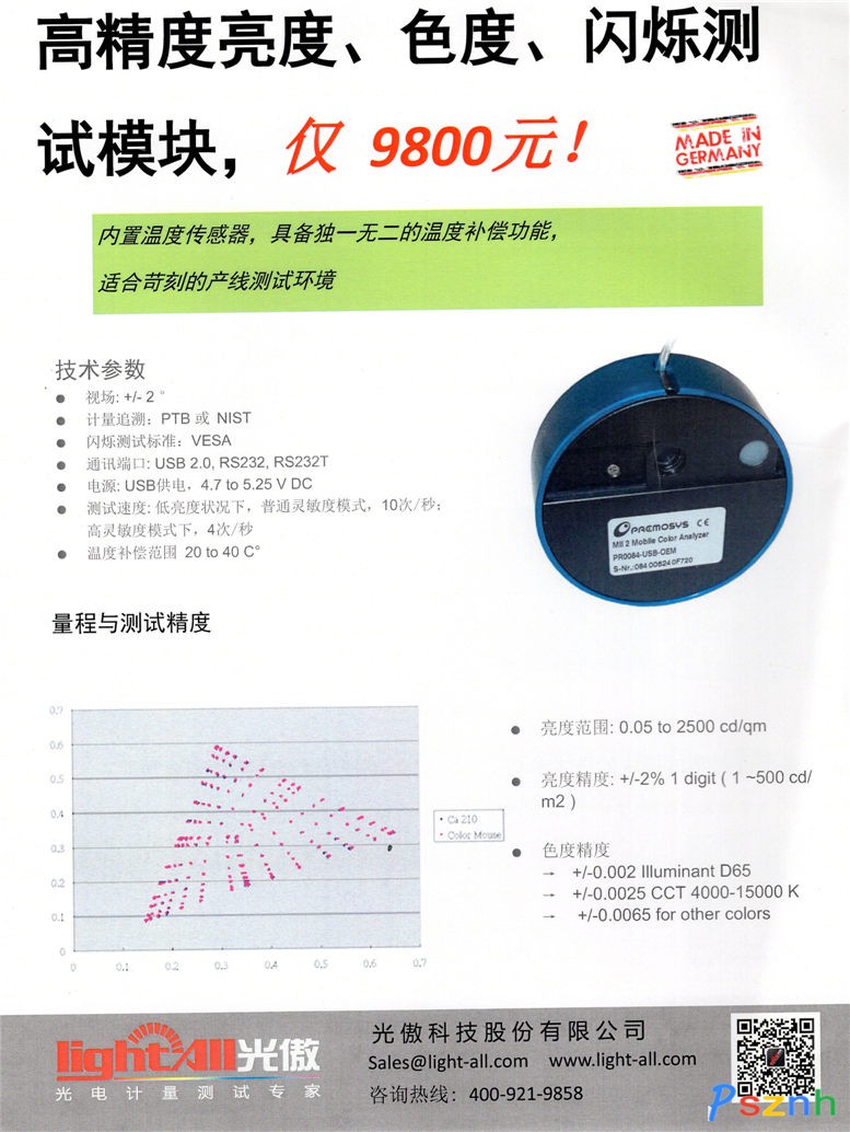 光傲科技自成立以來,始終專注于為客戶提供最專業、最合適的光電計量測試方案,包含實驗室測試、現場測試、產線測試  三大領域:  輻射度測量/Radiation Measurement 光電材料與器件測試/Material Test 精密光學測量/Optical Metrology 服務的行業:  國家及地方計量院所、質檢所 汽車、飛機座艙儀表及照明 航天、國防輻射計量測試 光電顯示行業 LED及照明行業 大學及研究院所 核心優勢:  覆蓋全產業的產品線: 從研發設計到測量、到生產;從芯片到燈具、到現場測試完整的產品線,服務客戶的每一步。 國際領先的供應商: 我們的供應商多是各自領域享有盛名的儀器制造商,是許多行業事實上的標準。 全面、系統的專業知識: 我們深刻理解探測器、光學材料元件、光路系統,具備同類公司所沒有的專業能力和行業經驗積累。 不斷提高的系統集成和技術支持能力 追溯NIST的校正實驗室:采用進口標準光源,目前可進行成像亮度色度計、光譜輻射亮度計、照度計的鑒定和校正工作 基于在線測試的系統集成能力:基于代理產品的高精度測試儀器,結合公司的軟硬件集成設計能力,已經為許多業內知名工廠提供成套產線測試系統。 產品優化設計咨詢:基于國際先進的仿真設計軟件,以及光源、材料測試平臺,解決客戶燈具、背光、顯示器產品開發過程中的各種疑難雜癥。 測試服務:基于公司自有進口測試設備,整合客戶資源和國外技術條件,提供復雜產品的測試服務。