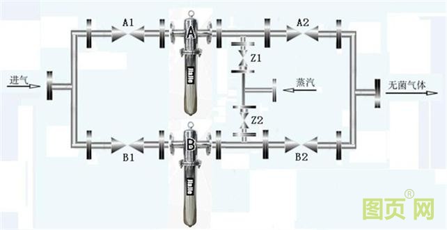 運行可以同時使用 A B 二臺過濾器①.打開 A1 A2 B1 B2 閥門,②.關(guān)閉 Z1 Z2 閥門