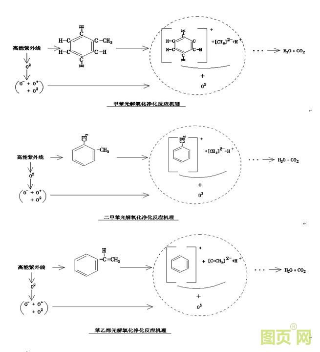 本產品利用特制的高能高臭氧UV紫外線光束照射氣體,在高能紫外線光束照射下,降解轉變成低分子化合物,如CO2、H2O等。利用高能高臭氧UV紫外線光束分解空氣中的氧分子產生游離氧,即活性氧,因游離氧所攜正負電子不平衡所以需與氧分子結合,進而產生臭氧。UV+O2→O-+O*(活性氧)O+O2→O3(臭氧),眾所周知臭氧對有機物具有極強的氧化作用,使氣體中的有機物質其降解轉化成低分子化合物、水和二氧化碳。