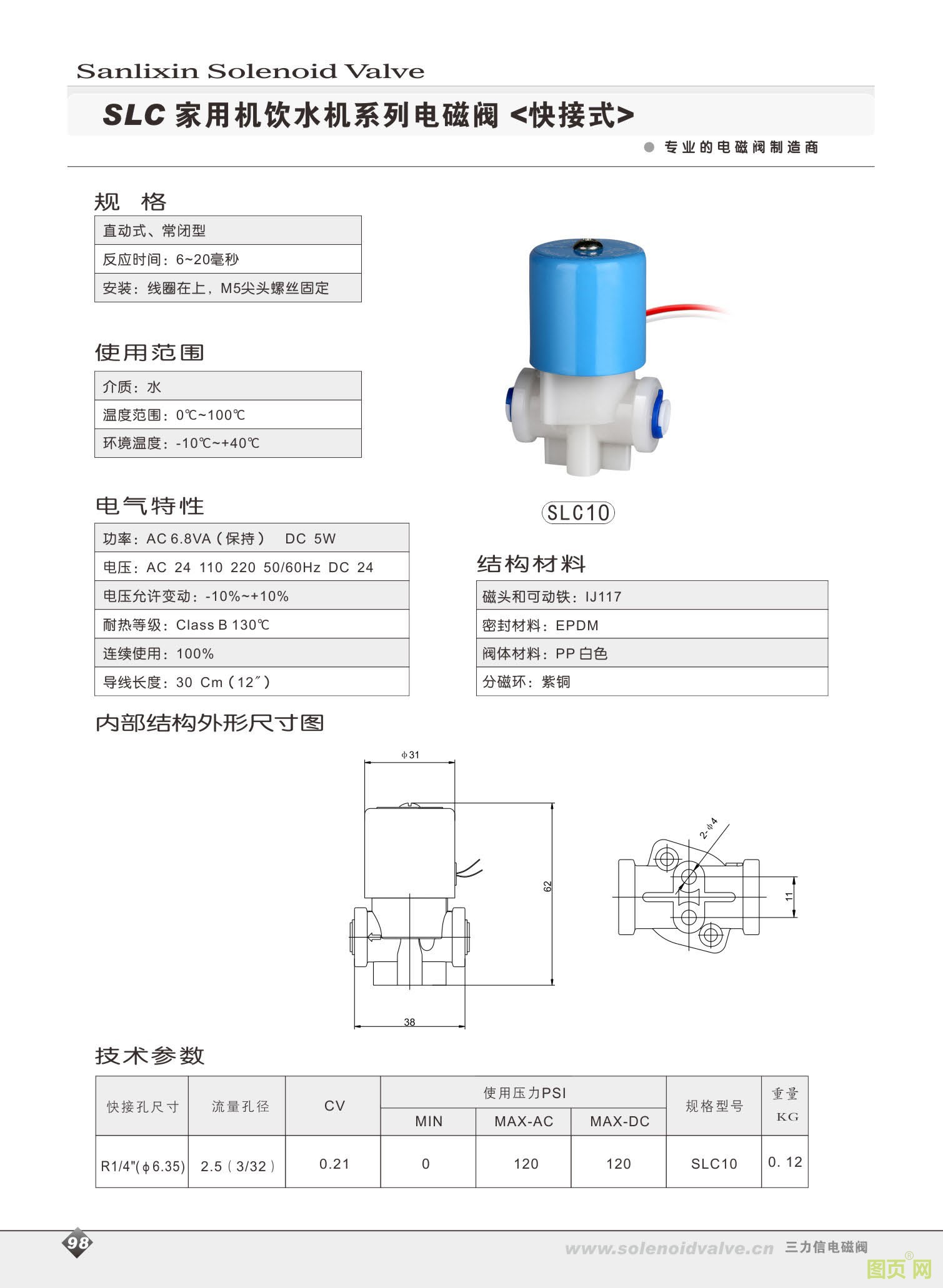 本網頁所展示的有關【三力信_SLC系列飲水機系列塑料電磁閥/常閉型_電磁閥】的信息/圖片/參數等由的會員【余姚市三力信電磁閥有限公司 】提供,由圖頁網會員【余姚市三力信電磁閥有限公司 】自行對信息/圖片/參數等的真實性、準確性和合法性負責,本平臺(本網站)僅提供展示服務,請謹慎交易,因交易而產生的法律關系及法律糾紛由您自行協商解決,本平臺(本網站)對此不承擔任何責任。您在本網頁可以瀏覽【三力信_SLC系列飲水機系列塑料電磁閥/常閉型_電磁閥】有關的信息/圖片/價格等及提供 【三力信_SLC系列飲水機系列塑料電磁閥/常閉型_電磁閥】的商家公司簡介、聯系方式等信息。