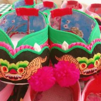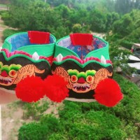 穿虎頭鞋是中國民間育兒習俗,流行于全國各地。虎頭鞋多用紅/黃布制成,鞋尖鑲一虎頭,因虎是“百獸之王”,故鞋頭中間繡一個“王”字。通常在小兒滿周歲或生日時穿新做的虎頭鞋,民間認為,這樣可為小孩壯膽、避邪,也有祝愿小孩長命百歲之意。