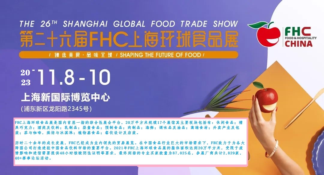 FHC2023上海環球食品展|2023上海國際食品展|2023上海進口食品展|2023上海高端食品展|2023上海烘焙展|2023上海乳品展|2023上海餐飲設備展|2023上海餐飲食材展|2023上海餐飲加盟展|2023上海食品包裝展|2023上海葡萄酒展|2023上海咖啡展|2023上海飲品展|2023上海有機食品展|2023上海肉類食品展|2023上海預制菜展|2023上海連鎖加盟展|2023上海餐飲設計展|2023上海食品飲料展|2023上海冷凍食品展|2023上海食品展|2023上海食品機械展