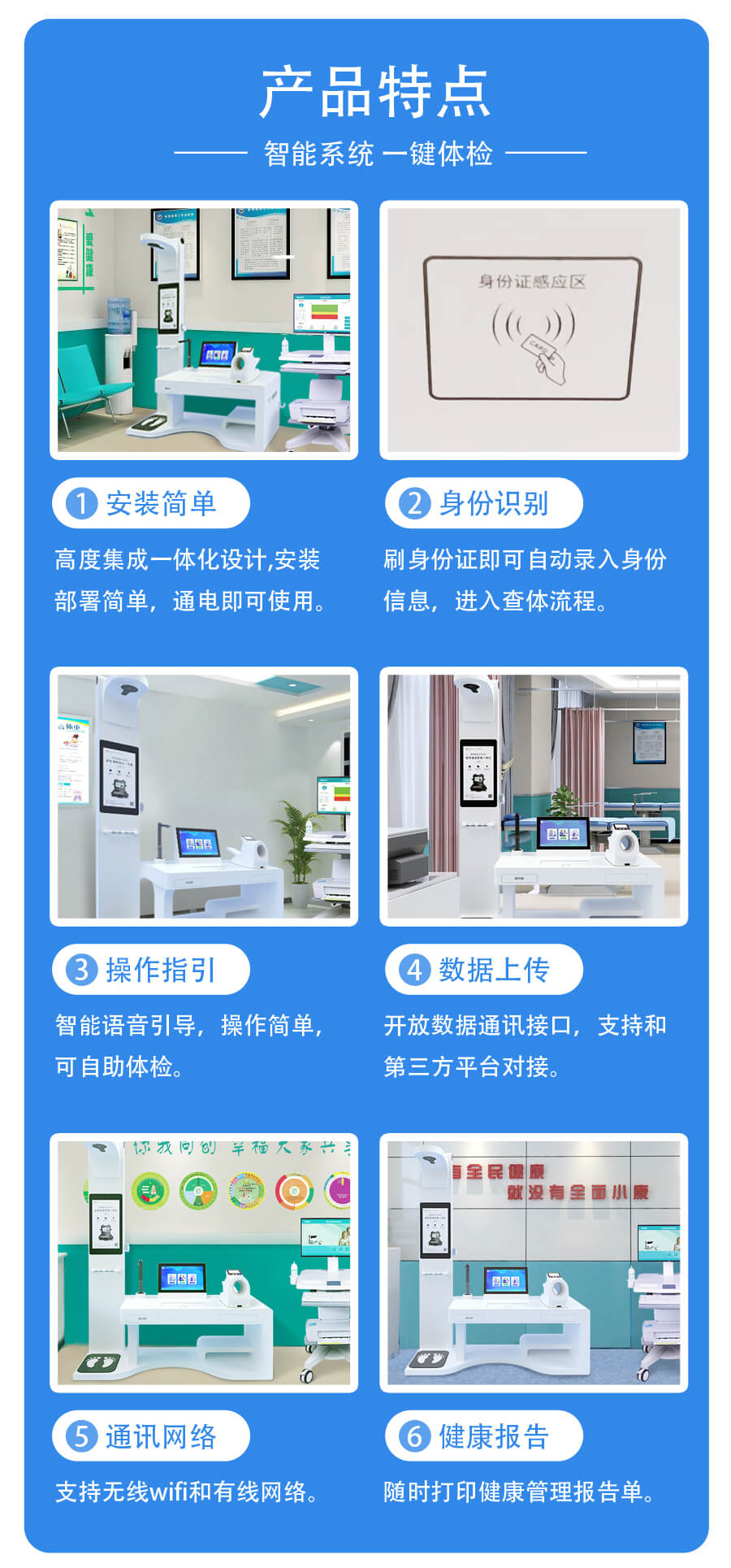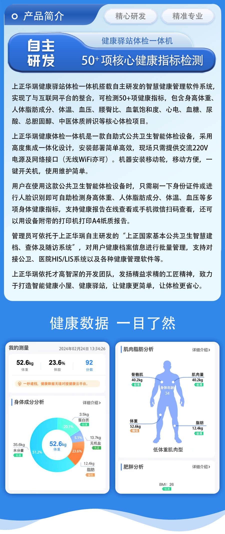 再者,上正華瑞大型健康體檢機可以自動上傳測量結果,生成科學的健康報告。其內存儲量高,支持數據共享,能夠對接國家公衛管理系統、醫院HIS/LIS系統等醫療平臺,方便管理測量者的健康數據,簡化數據傳輸與管理流程,提高人工工作效率。此外,這些健康數據還可以對接到當地醫療衛生機構,實現實時監控與風險預警,有助于提升基層醫療機構健康服務水平,改善基層醫療服務條件。