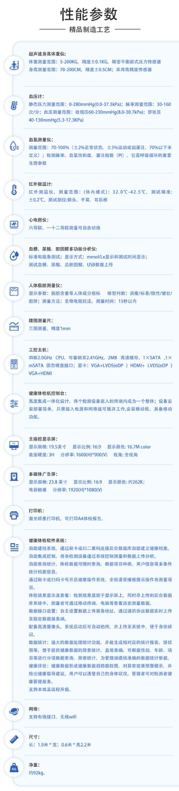 首先,上正華瑞健康體檢一體機(jī)能夠快速、準(zhǔn)確地完成多項醫(yī)學(xué)檢查,包括身高、體重、血壓、心率、血氧飽和度、血糖、血脂等。這些檢查通常是日常查體工作中必不可少的項目,而健康體檢一體機(jī)能夠在短時間內(nèi)自動化地完成這些檢查,大大提高了查體工作的效率。
