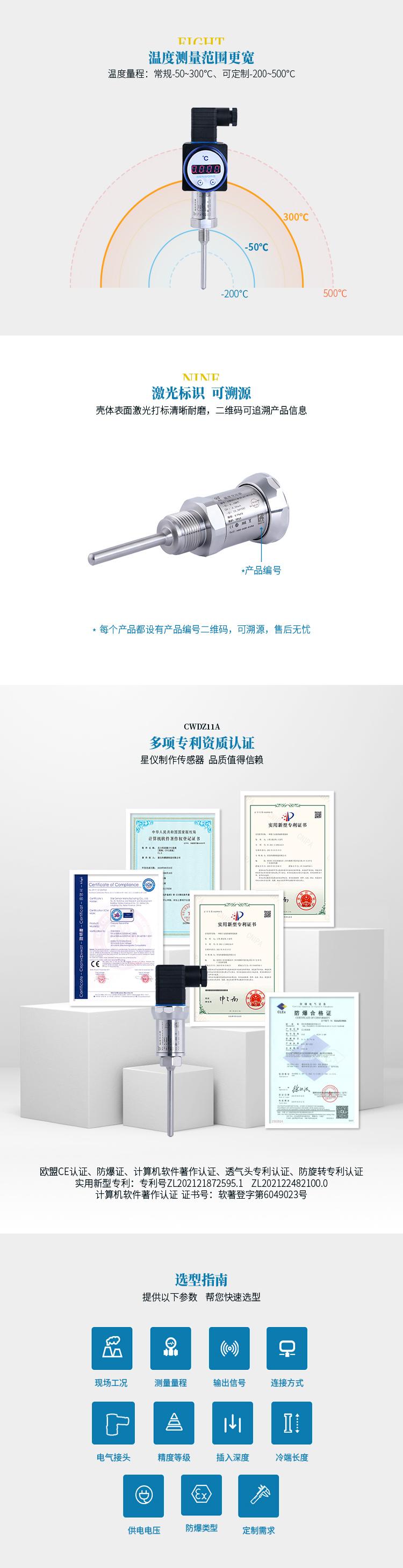 CWDZ11A通用型溫度變送器設計精心,適合通用工業,多種接口和探桿的組合實現了不同的組合效果,適合不同工況的選