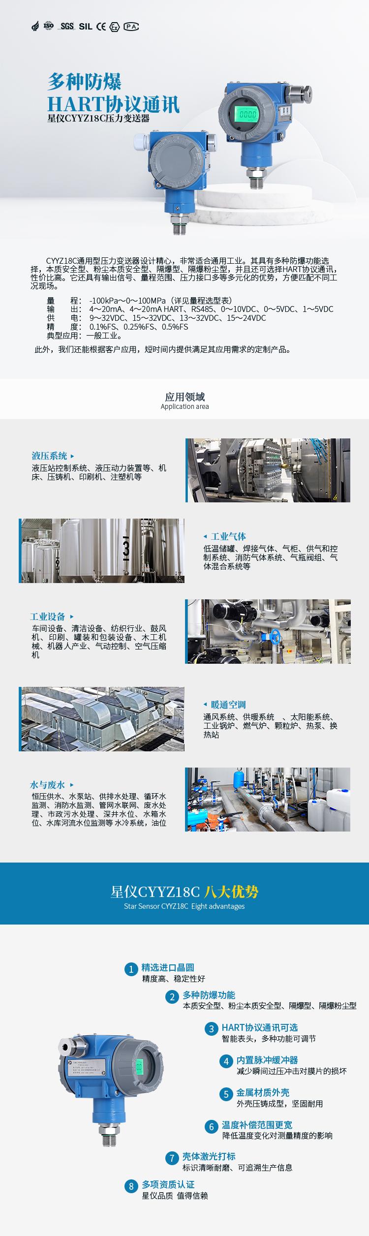 此外,我們還能根據(jù)客戶應(yīng)用,短時間內(nèi)提供滿足其應(yīng)用需求。壓力變送器CYYZ18C系列可以根據(jù)型號的不同進行絕壓、負(fù)壓和表壓的測量。適用于液體或氣體和流程工業(yè)的壓力測量。
