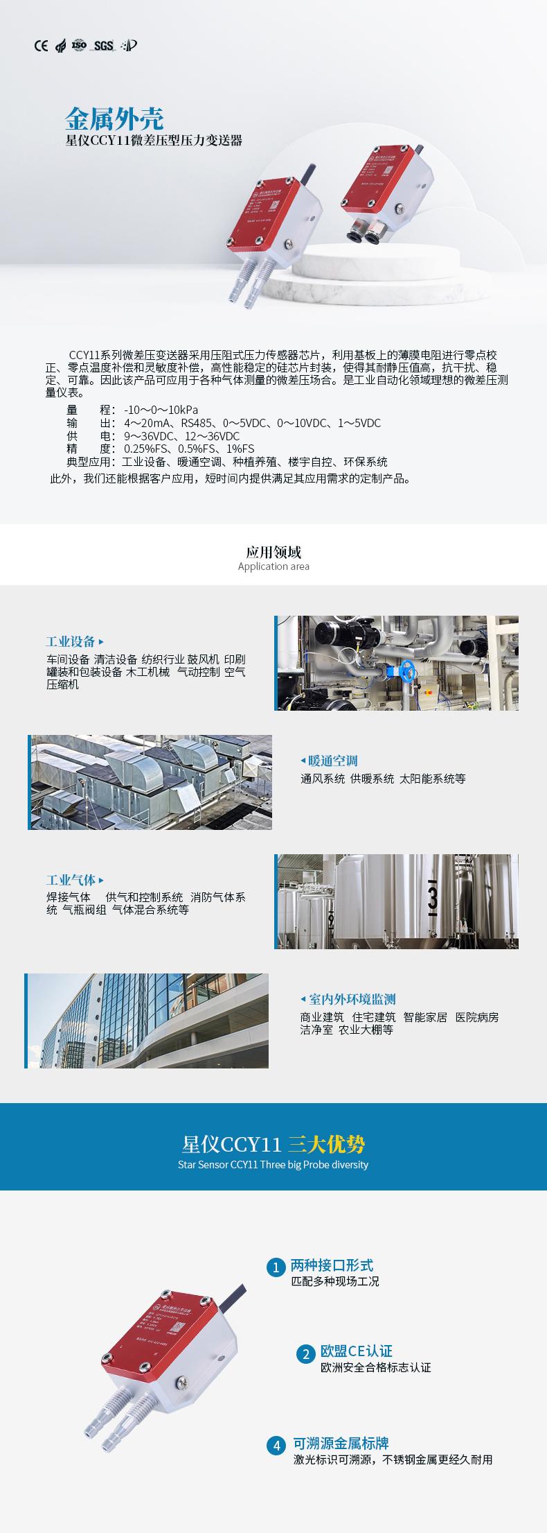 星儀微差壓變送器CCY11系列適用于氣體和壓縮空氣的差壓測量。典型應用于醫療設備、暖通與空調、工業控制等工業領域