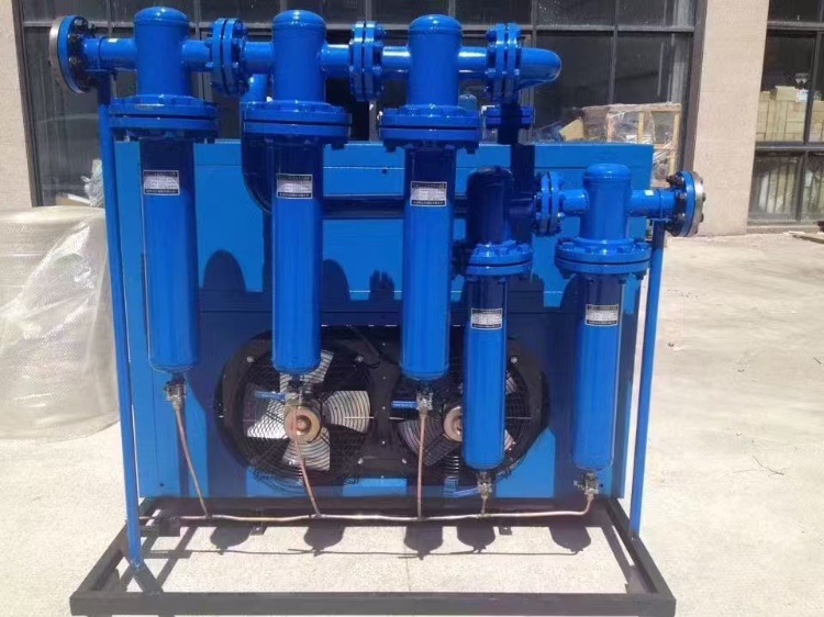 熱交換器、風冷凝器選用y質銅管帶純鋁鰭片,擾流結構換熱效率高、因而體積小,結構緊湊。筒體材料選用不銹鋼或碳鋼鍍鋅,可避免對壓縮空氣的二次污染。