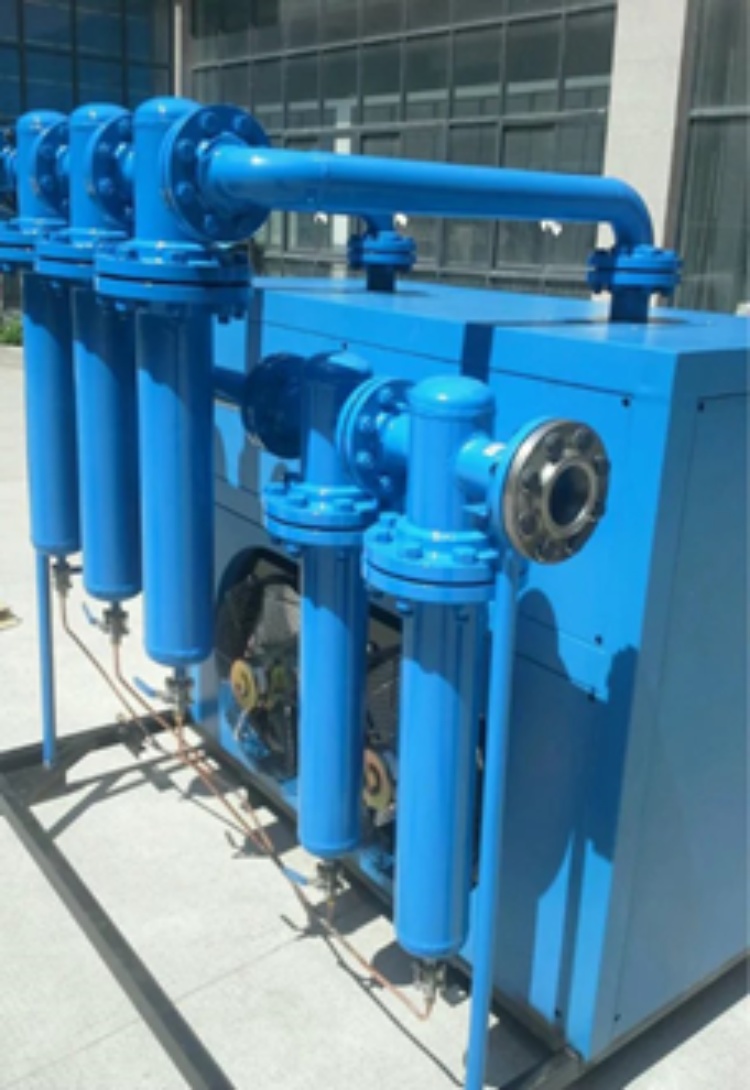 冷凍式干燥機是根據冷凍除濕原理,利y全f閉壓縮式制冷系統,對經空壓機排出的壓縮氣體冷卻降溫,使其中所含的大量飽和水蒸氣、油霧凝結液滴,經過經氣水分離后由自動排水器排出。較高溫度的飽和壓縮氣體進入冷干機的預冷器,在預冷器中與來自蒸發器的干冷氣體進行熱交換,降低溫度后進入制冷系統的蒸發器,與冷媒蒸汽進行d二次熱交換,使本身溫度降到接近于冷媒的蒸發溫度,在兩次降溫過程中,壓縮氣體中的水蒸汽得以凝結成液態水滴并隨氣流進入氣水分離器,分離下來的液態水經自動排水器排出機外,溫度較低的干燥壓縮氣體進入預冷器,與剛進入的濕飽和氣體進行熱交換,使本身溫度得到提高,從而在冷干機排氣口得到含水量較低(即l點較低)、相對濕度也很低的干燥壓縮氣體。冷凍式干燥機由于工作可靠、管理方便、運行f用低l而成為各行業空壓站房凈化設備的s選機型。